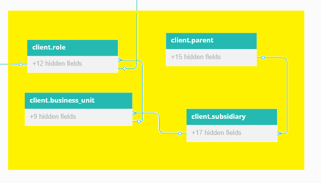 The role based organizational hierarchy is built using four key tables, part of the client schema, shown highlighted in the image at the top of this blog: