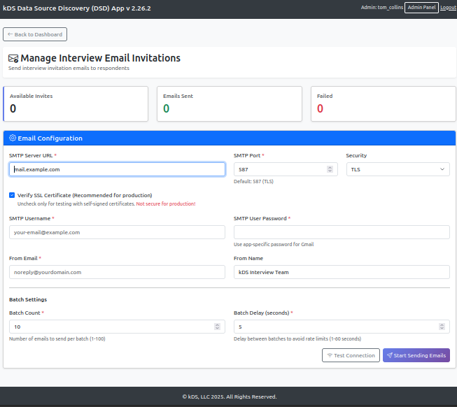 The kDS Discovery App conducts structured interviews with organizational stakeholders to capture tribal knowledge about data systems. A typical deployment might need to send hundreds of interview invitations across multiple departments, each with: